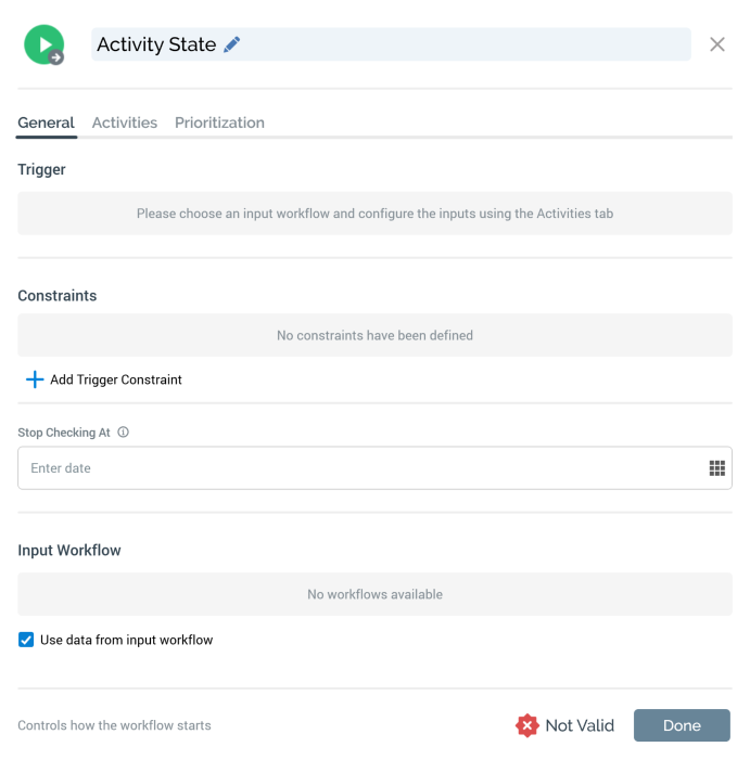 A checkbox (Use data from input workflow) is displayed at the bottom of the General tab. It is checked by default. If checked, the input data for the activity state trigger's workflow will be sourced from its input workflow – you must define within any activities downstream from the activity state trigger the fulfillment states that are to apply. For example…