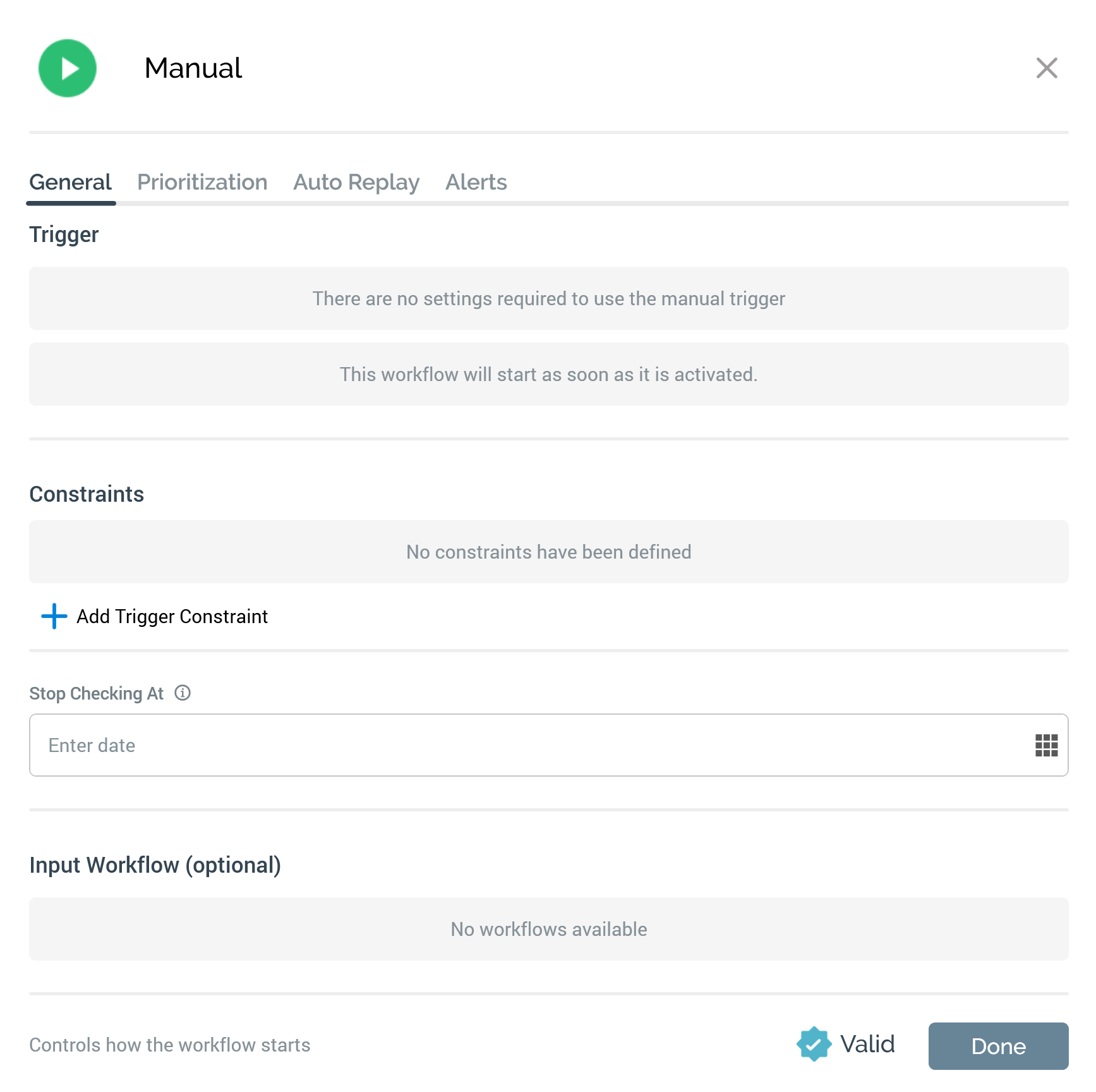 A manual trigger’s configuration panel contains General, Prioritization, Auto Replay, and Alerts tabs: