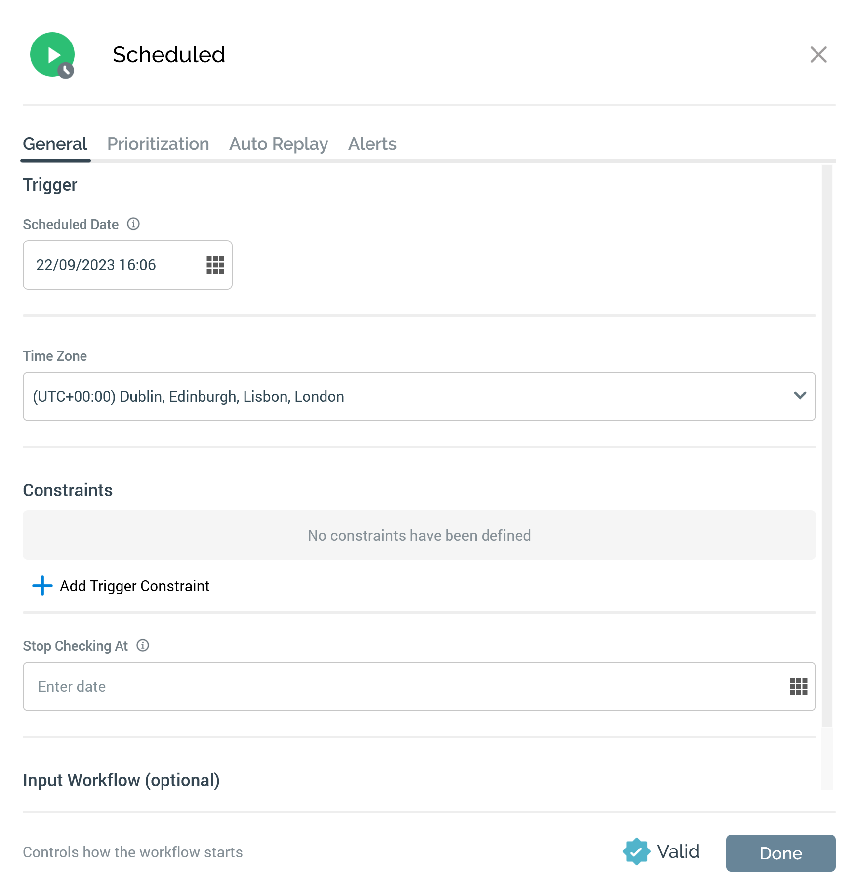 Input workflow: optionally, you can elect to define an input workflow for the scheduled trigger. Learn more about input workflows.