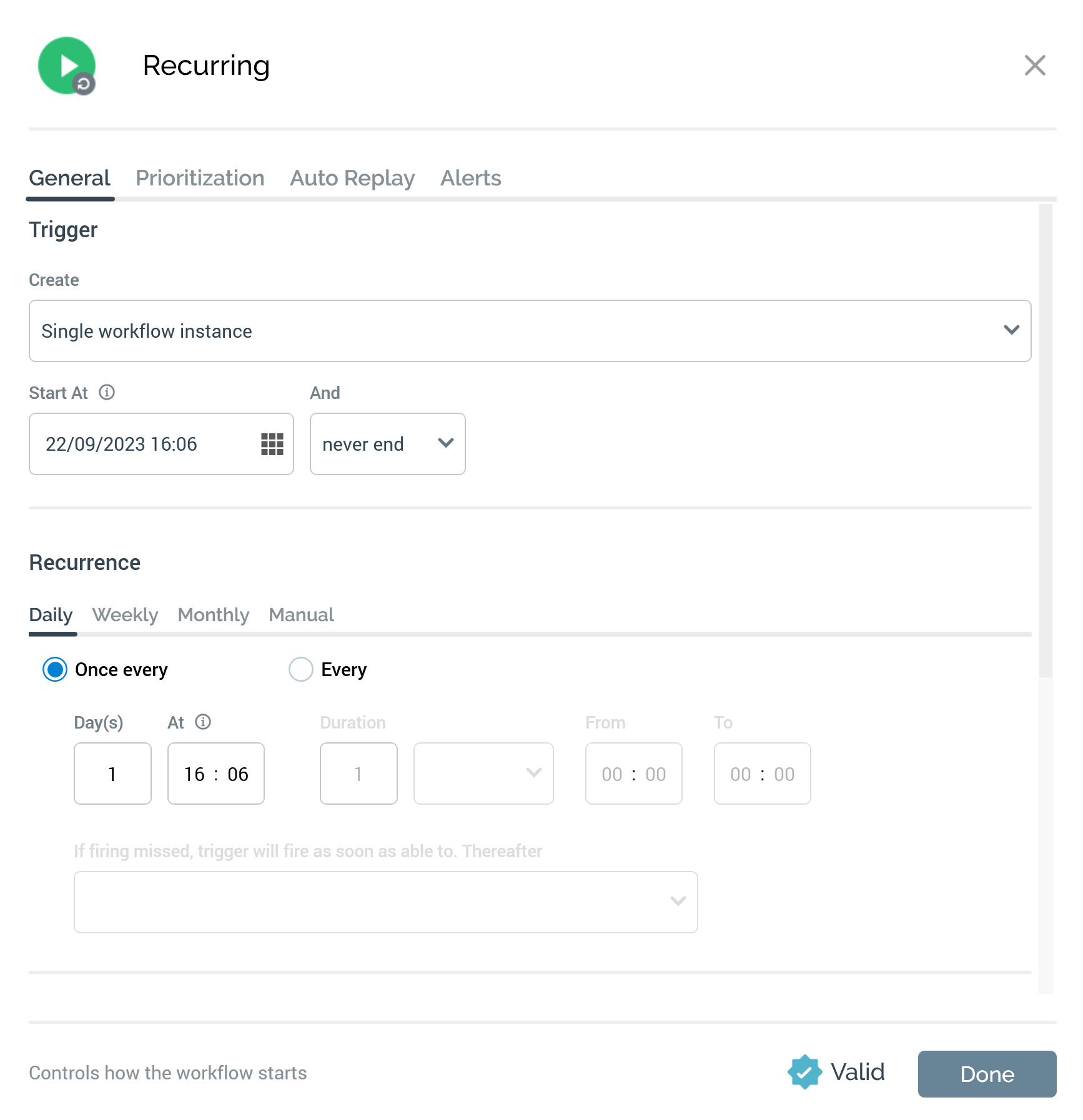 A recurring trigger’s configuration panel contains General, Prioritization, Auto Replay and Alerts tabs: