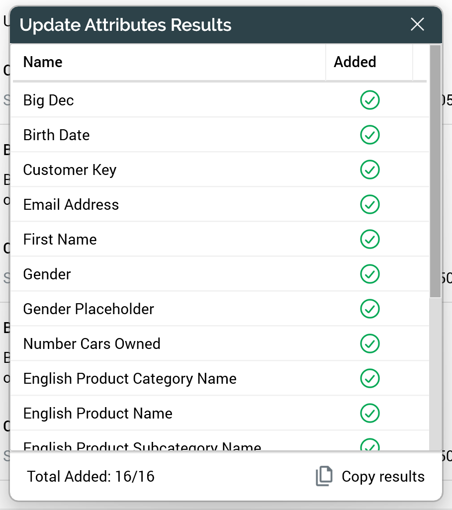 On successful completion of the job, selecting the Results button displays a window in which you can view a list of attributes, along with results for each.