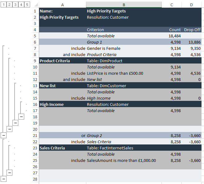 On selecting Open File, the waterfall report is displayed in Excel (which must be installed for the report to be run). A waterfall report contains: