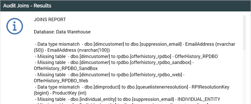 When the job completes, you can select the View Results button to display the Audit Joins – Results dialog.