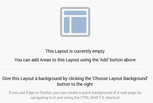 The Layout control appears below the toolbar. A representation of the current layout, optionally displaying an image selected at the layout's Choose Layout Background property, is displayed below the toolbar. When an image has not been associated with the layout, and no areas have been added, the following is displayed: