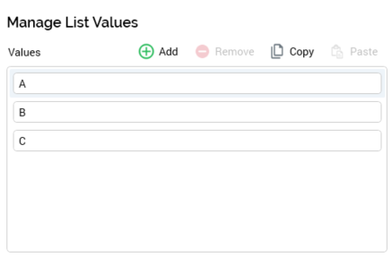 The Manage List Values dialog facilitates the specification of a constrained list of values appropriate to the field. It contains the following: