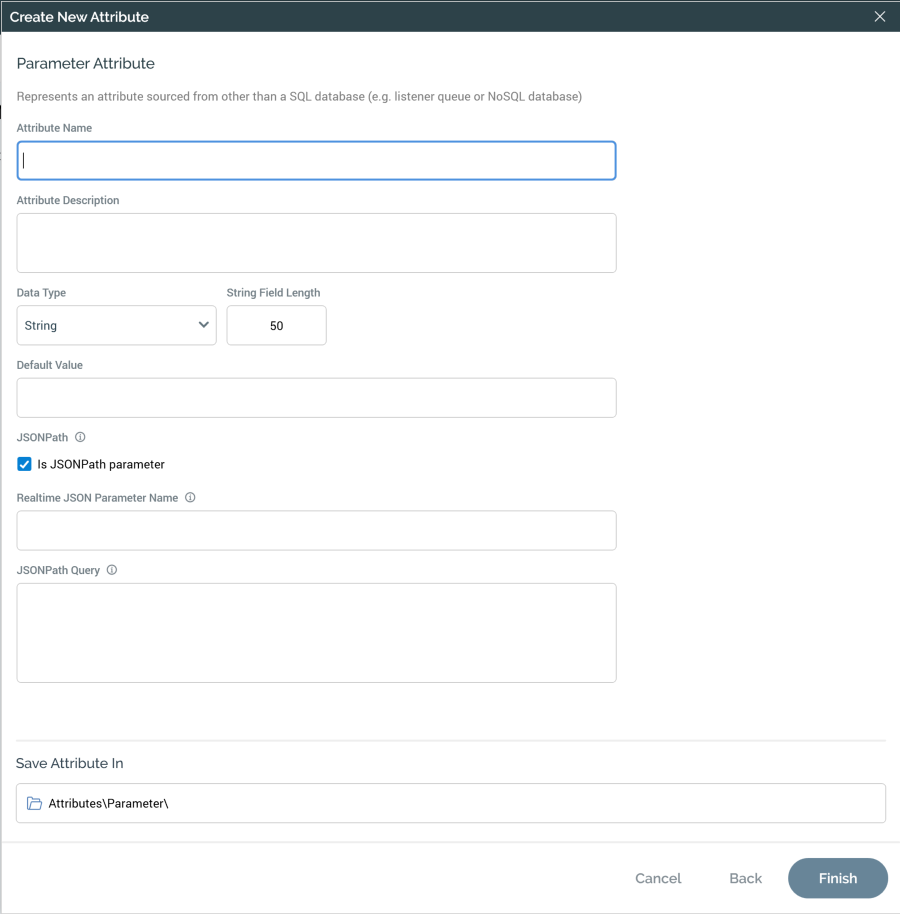 Is JSONPath parameter: check this checkbox to indicate that the parameter attribute is a JSONPath parameter. When checked, the Realtime JSON Parameter Name and Query properties are shown.