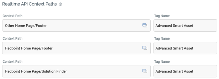 Lists the smart asset's association with Realtime Context Paths. These provide an optional approach to accessing published Smart Assets when using the RPI Realtime API. Smart Assets are associated with Realtime API Context Paths at layouts and areas in the Realtime Layouts interface. For more information, please see that section's documentation.
