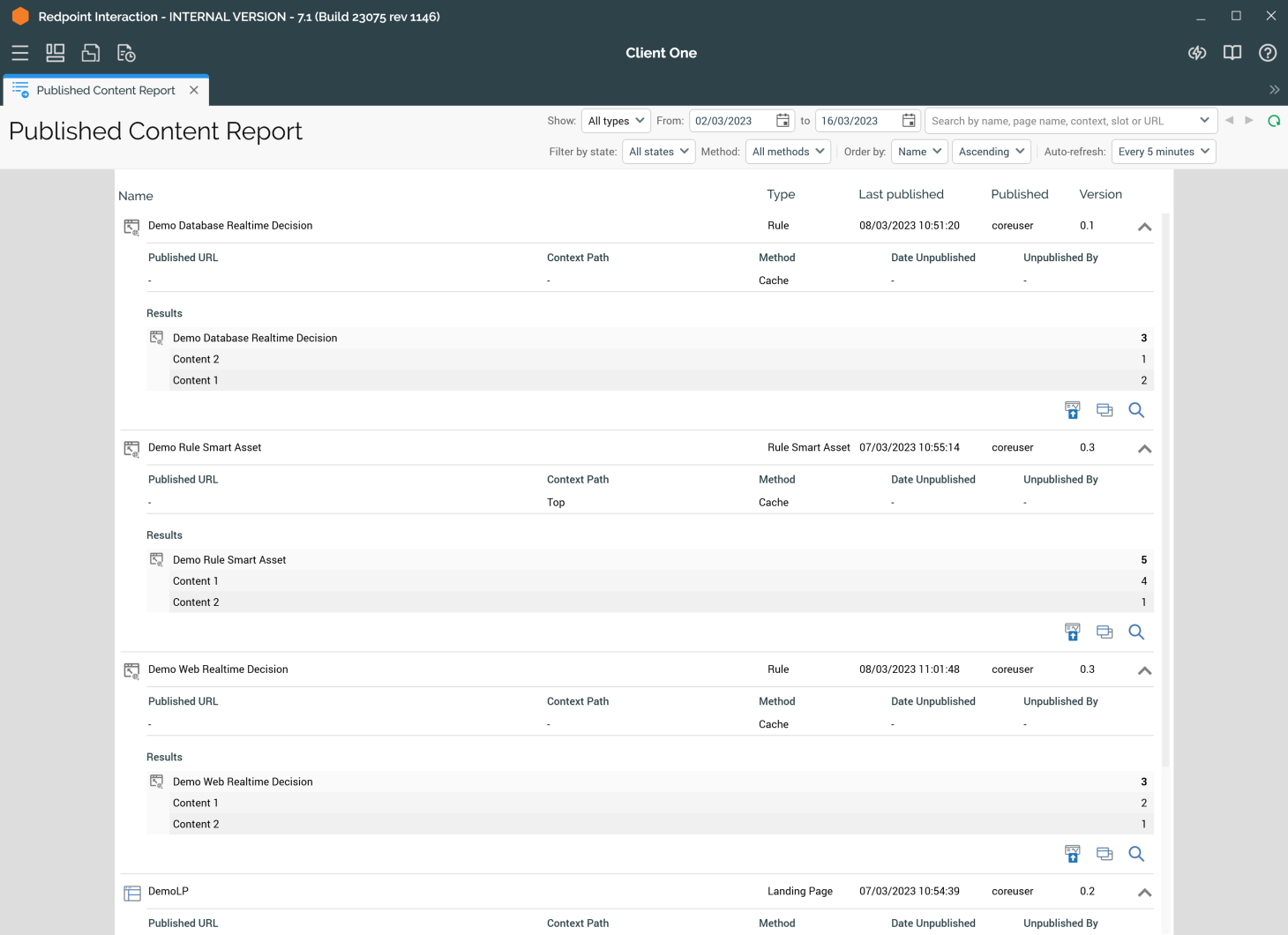 The Published Content Report allows you to view a list of published (and, if required, unpublished) content at the current RPI tenant.