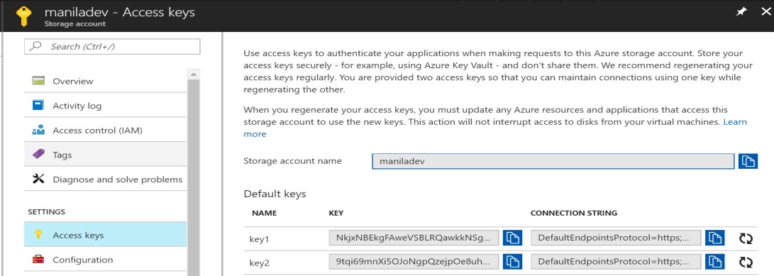 Under Default keys, use the key1 connection string to configure the storage connection string of the RPI Azure Event Hubs queue provider.
