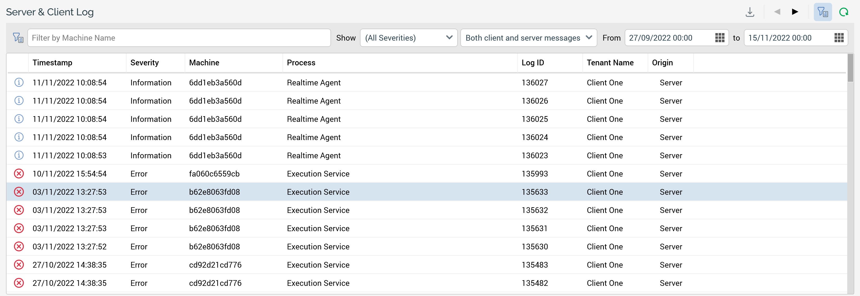 Tenant Name: when logged in as a cluster administrator, non- tenant specific entries can be viewed in the Server & Client log. At the same, the Tenant Name property is set to the value "Cluster". When not a cluster admin, non- tenant entries are not shown.
