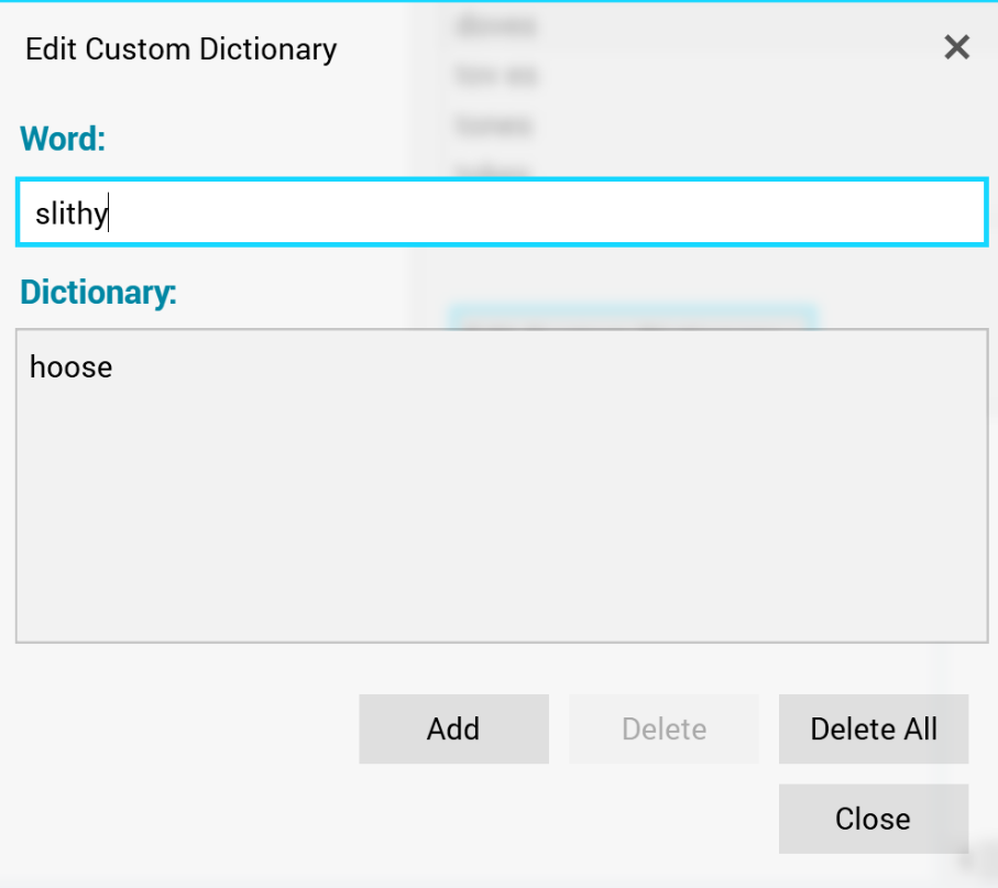 Delete: this button is available when a word is selected in the Dictionary list. Invocation removes the word without display of an Are You Sure? dialog.