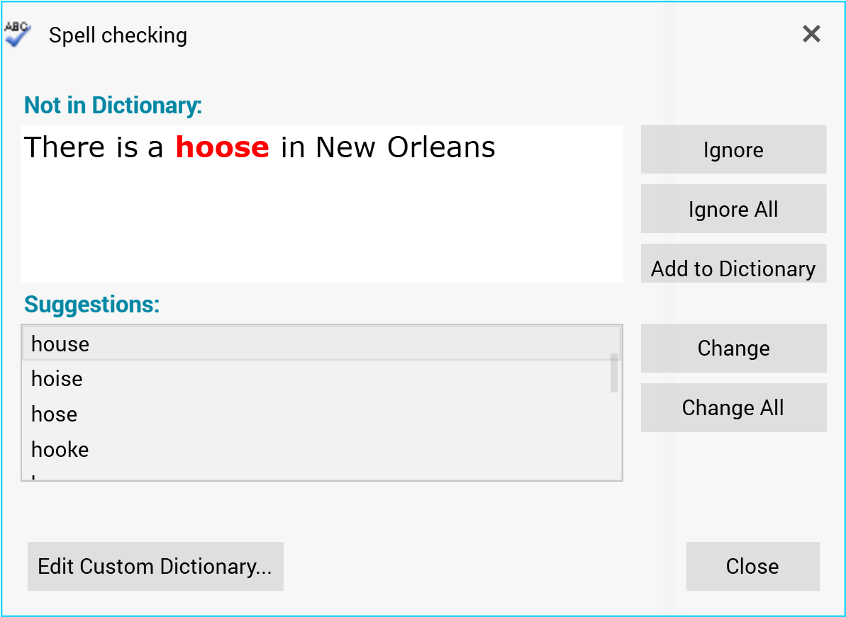 Change All: this button is available when a suggestion is selected. Selecting it changes all instances of the spelling error for the suggestion.