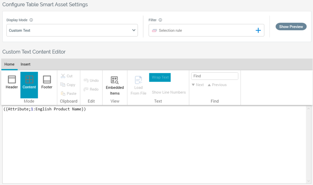 When the table smart asset’s Display mode is set to Custom Text, the table smart asset content panel contains the following: