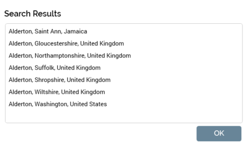 Show search results: selecting this button lists locations matching the entered Location in the Search Results dialog: