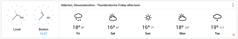 When displayed in a dashboard, a Time and Weather widget is shown in accordance with its current settings.