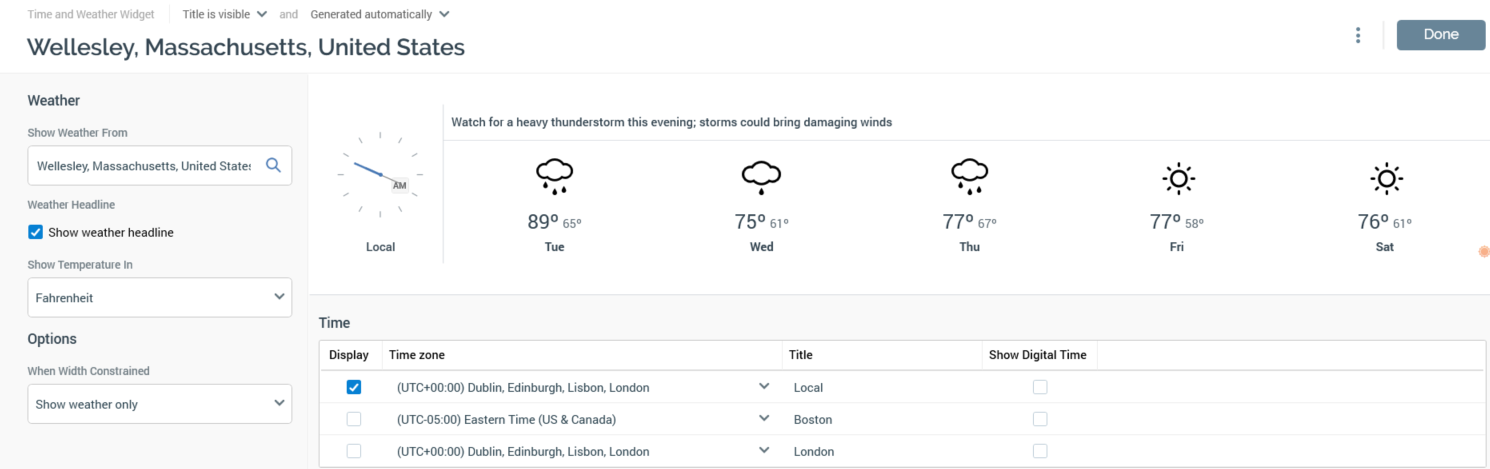 Show Weather From: this field allows you to specify a search string, which can be used to find a location for which to display a weather forecast. Specifying a value enables the Search button. The property defaults to “Wellesley, Massachusetts, United States”.