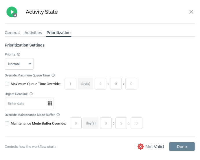 Override Maximum Queue Time: this property allows you to override the system default for how long an activity within the workflow can wait on the queue. A checkbox, it is unchecked by default. When checked, the Maximum Queue Time Override property is enabled.