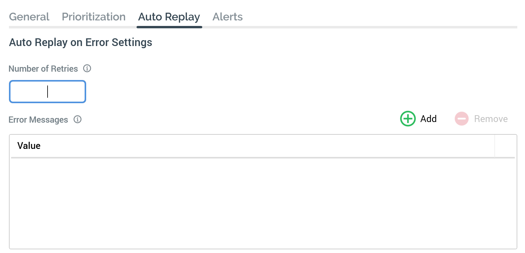 List of error messages: you can optionally specify a series of error messages. An error message is a string of characters, which, when an error occurs, RPI will attempt to match to the resultant error's message text. If a partial match occurs, RPI will retry the action that caused the error to occur. Retries will be performed a number of times in accordance with the Number of retries setting, and retry details written to the activity’s execution log. The delay between retries increases each time to a maximum of one hour.
