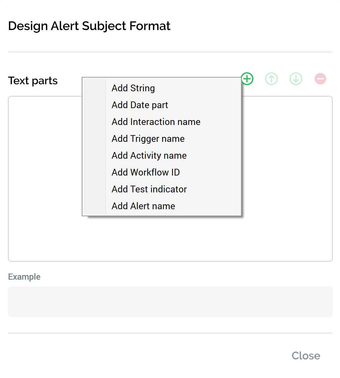 Custom email subject text: this optional text property allows you to customize alerts' subject lines. It is set using the Design Alert Description Format dialog. On configuration of Custom email subject text, a summary thereof is displayed at the property.