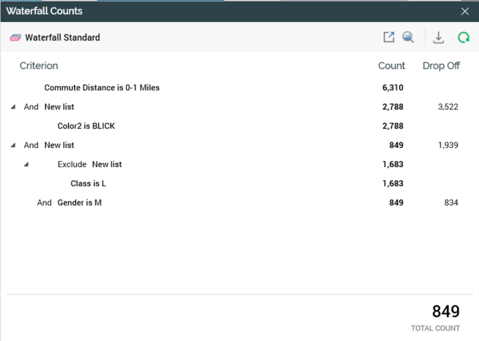 The Waterfall Counts Window displays a waterfall count view of a standard or basic selection rule's criteria. Access to the Window is controlled by the Selection Rule—Basic/Standard—Count functional permissions.