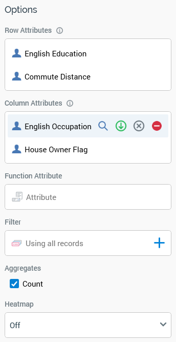 Aggregates: this property allows you to control the type of count values displayed at cells within the pivot table results. A list of available aggregates is displayed when a Row attribute or Column attribute are provided. Each is accompanied by a checkbox.