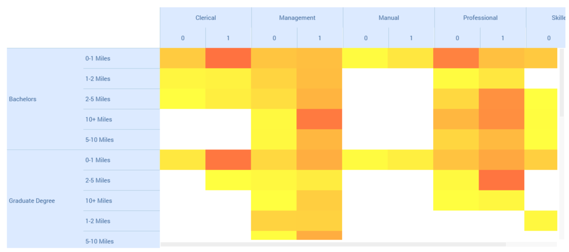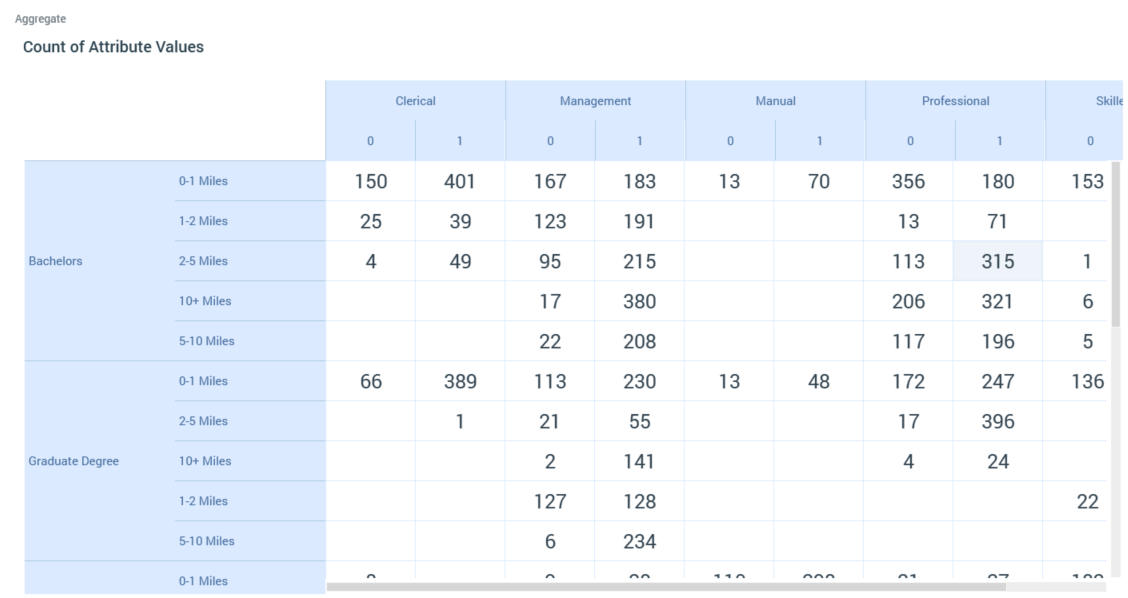 If an aggregate other than Count is displayed, a cell shows the aggregated value of the Function attribute in the context of the cell’s row and column values. For example, if Function attribute Yearly income and aggregate Average are selected, a cell will display the average yearly income for its unique combination of row and column values.