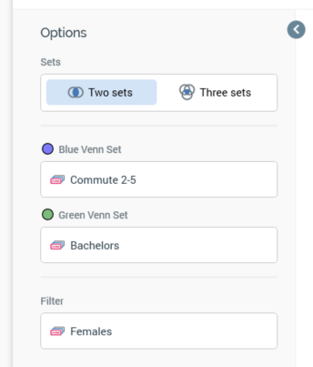 Sets: you can use this property to choose whether to display two or three Venn sets. By default, a new Venn diagram is configured with two sets. If you change a three-set diagram to a two-set diagram, having configured all of the former’s Venn sets, the top two Venn sets are retained in the latter context; on reverting back to a three-set diagram, the original third Venn set’s selection rule configuration is lost.
