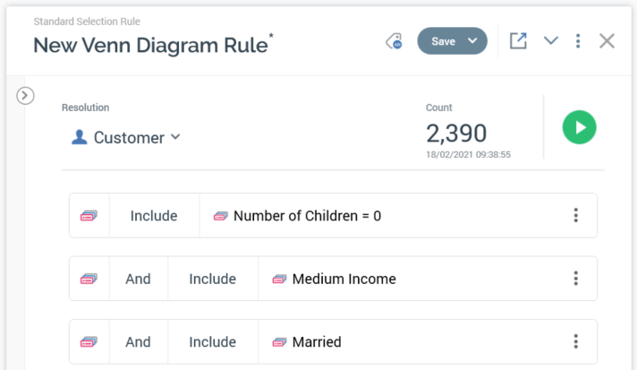 Having prepared the Venn diagram, you can refresh the counts of the Venn sets and the intersects between them. You can then choose to create new selection rules by dragging segments of interest and dropping them onto the Rule Designer workspace.