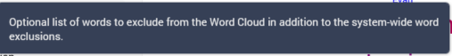 Word exclusions: this optional property allows you to specify a list of words that will be excluded from the work cloud’s results. Note that any custom word exclusions provided complement the system-wide set of default word exclusions defined by system configuration setting WordCloudExclusions.