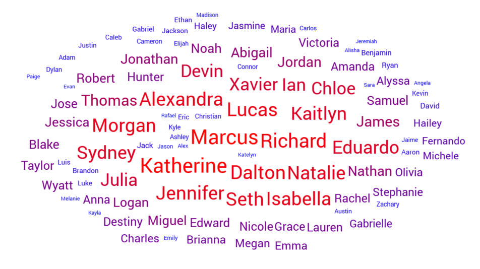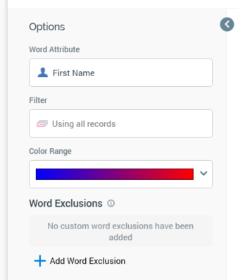 Color range: this property allows you to specify the range of colors to be used when displaying the word cloud. The most frequently-appearing word(s) assume a color at one end of the scale, the least-frequently at the other.