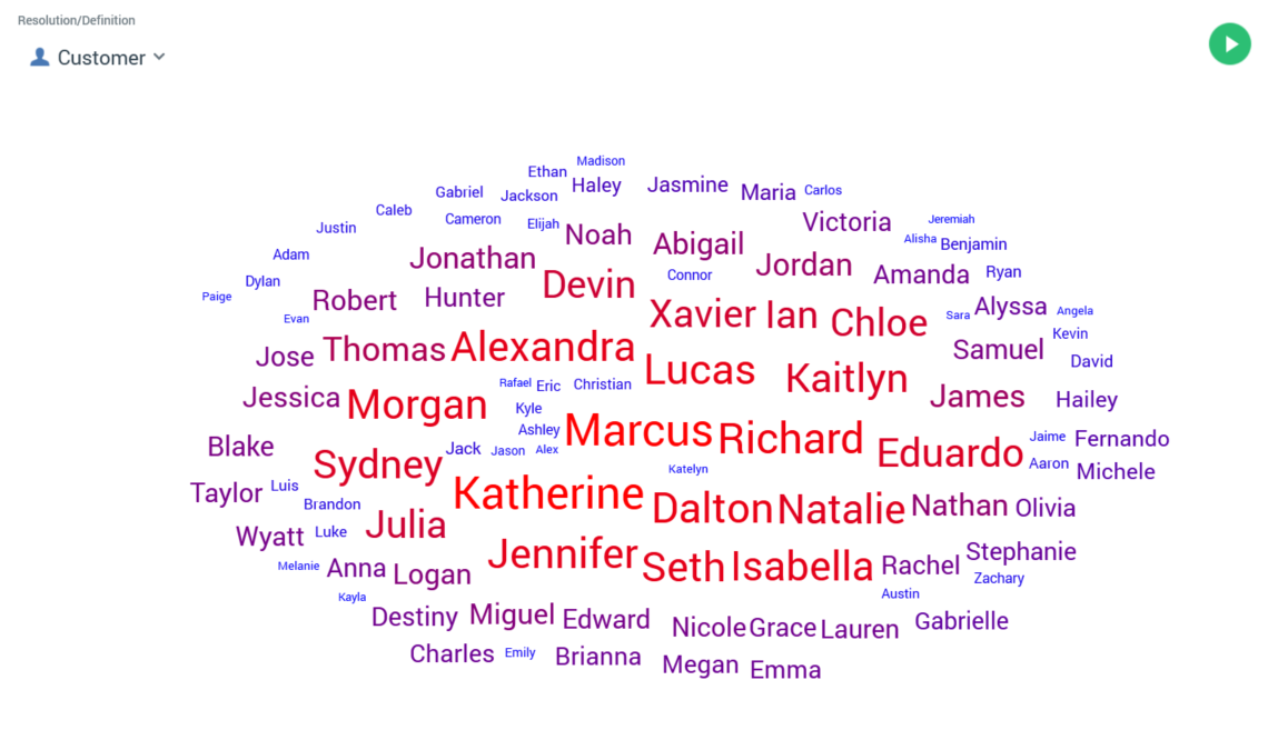 Words that appear within a text attribute’s set of values are ranked in terms of frequency, with the most common words being shown in the largest font. A color range is also applied to increase the word cloud’s visual impact.