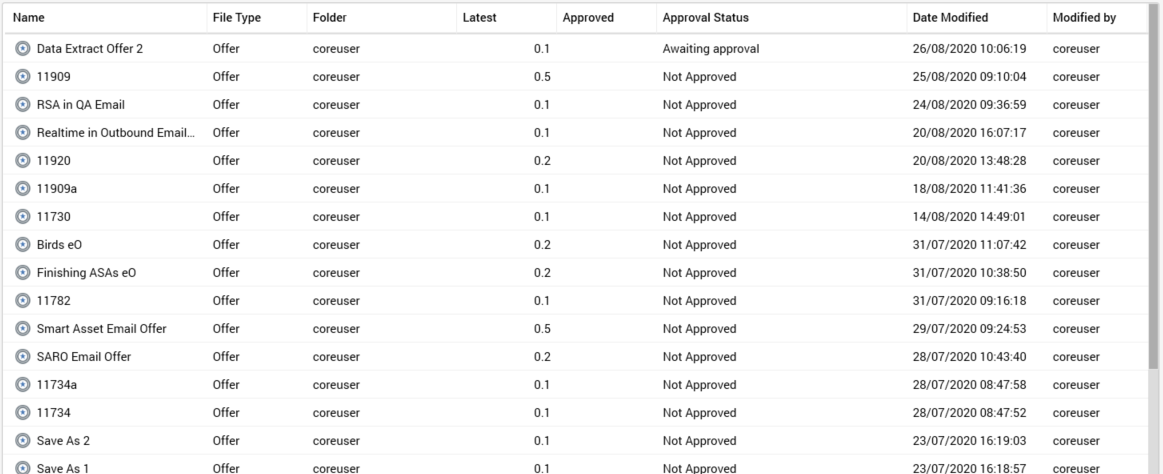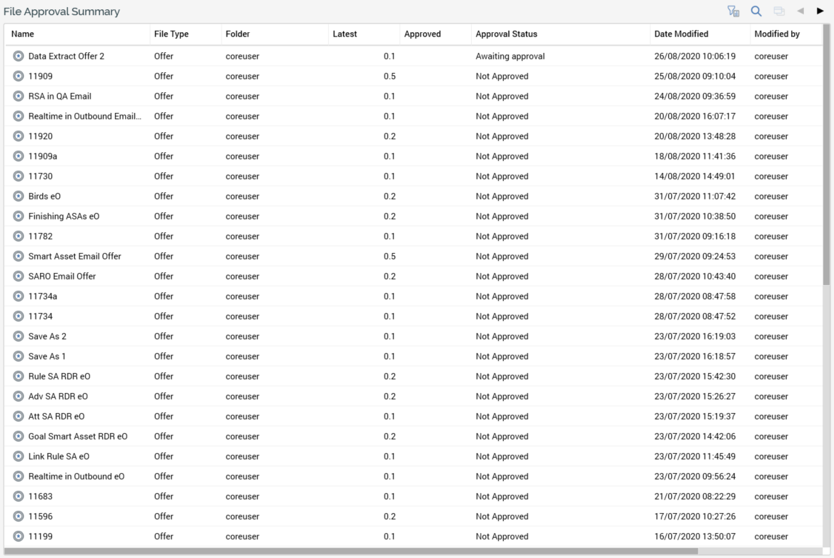The Approval Summary interface provides an at-a-glance synopsis of the current approval states of files of types for which file approval is enabled within the current client’s RPI server installation. Currently offer and interaction files support approval processes.