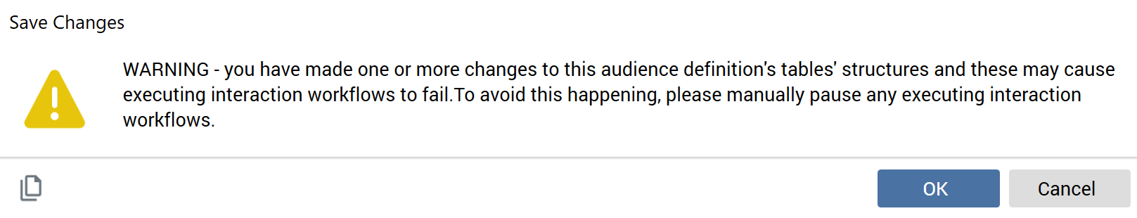 If you elect to proceed with the save, create or modify actions may be undertaken against the following database tables as defined within the audience definition: