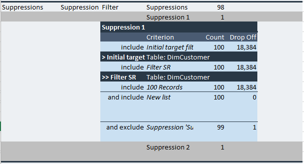 You can expand each block to view more detail using the left-hand ‘+’/ ‘-’ buttons. This can be repeated to view increasing amounts of detail (displaying details of e.g. selection criteria, suppressions, splits, etc.).