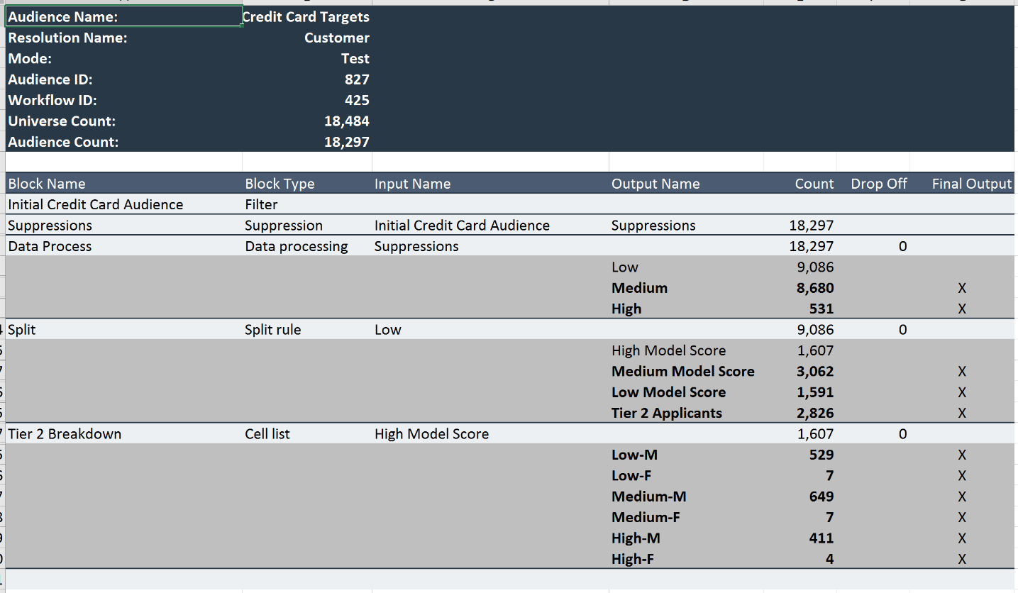 Each block in the audience is displayed as a separate section in the report. For each, the following are shown: