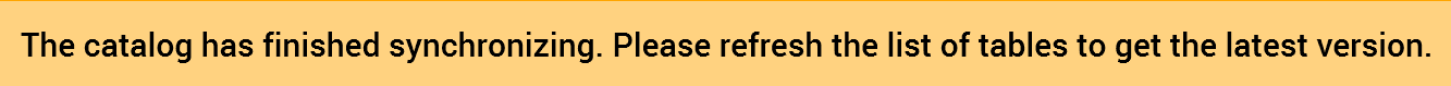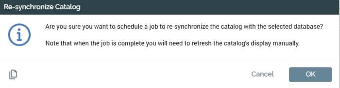 If you proceed, a Catalog re-sync job is created and displayed in the My Jobs Dialog. Full details of the job and Dialog can be found in the My Jobs documentation.