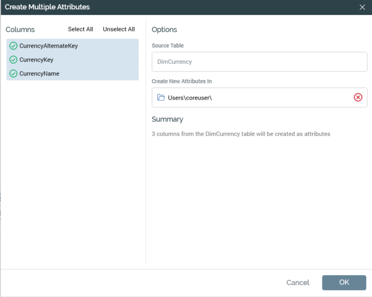 Summary: a read-only of the action to be undertaken: '[n] columns from the [Table Name] table will be created as attributes'.