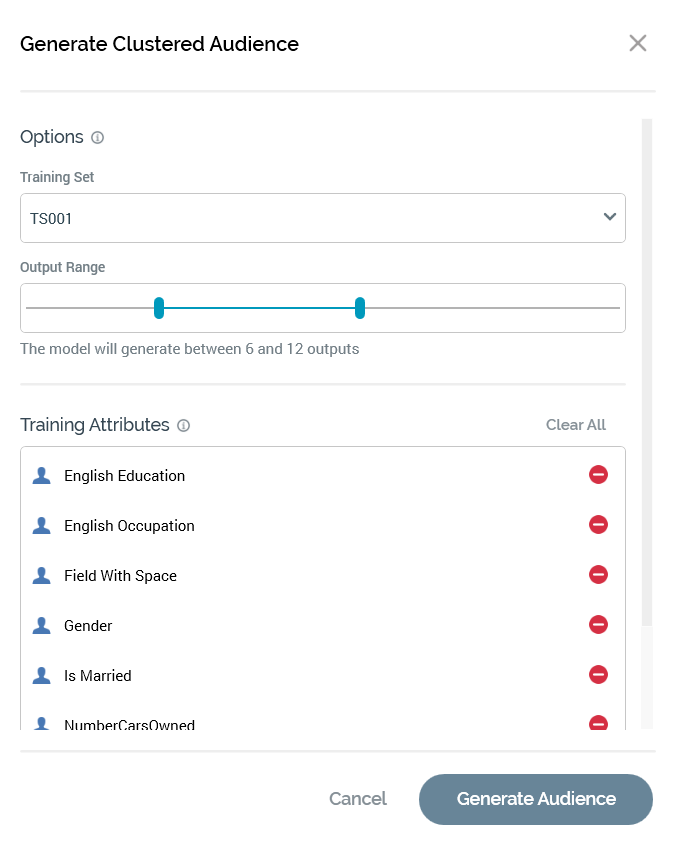 Training Attributes section: this section is used to define the attributes used to source training data to build the cluster model.