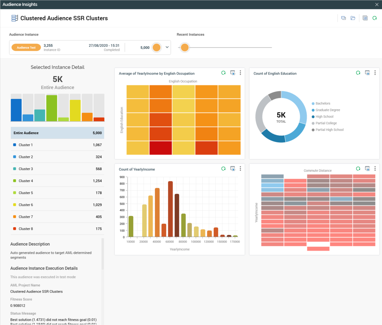On the job's completion, a View Results button is available at the job when displayed in the My Jobs dialog. Clicking the button displays the Audience Insights Window, in which are displayed the newly-generated cluster audience's test execution details.