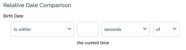 If any value other than ‘Is within’ or ‘Is’ is selected, the label ‘the current time’ is displayed to the right hand side of the drop-down.