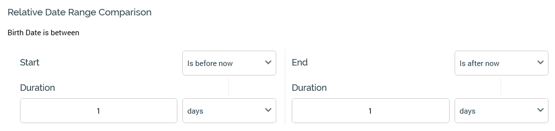Duration: this integer property is only shown when [Dropdown] one of Is Before Now or Is After Now. It defaults to the value 1, and accepts a minimum value of 1, and a maximum value of 999,999.