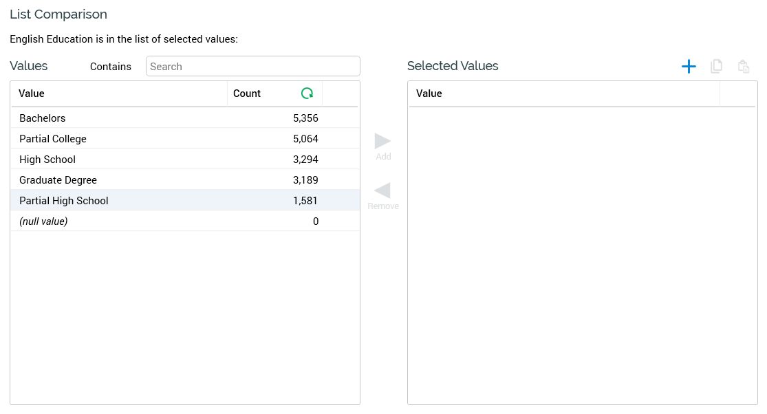 Add: the top of the two buttons displayed between the Values and Selected Values list is available when at least one value is selected in the Values list. Invocation adds the value(s) to the Selected Values list. Attempting to add a value already in Selected Values list has no effect.