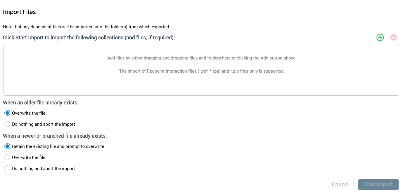 You can select the .rpf files you wish to import and click Open to commence their import. Doing so displays the file(s) in the Import Files overlay (see below). You can also select a zip file containing exported RPI files. Clicking Cancel removes the Windows dialog and returns to the RPI File System Dialog.