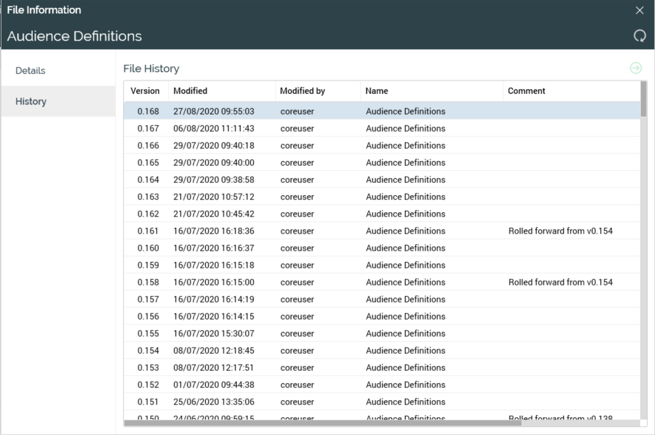 History: this button is available at all Configuration interfaces except Catalog, System Configuration, User Groups and Users. Clicking it displays the configuration collection’s history details in the History tab within the File Information Dialog.
