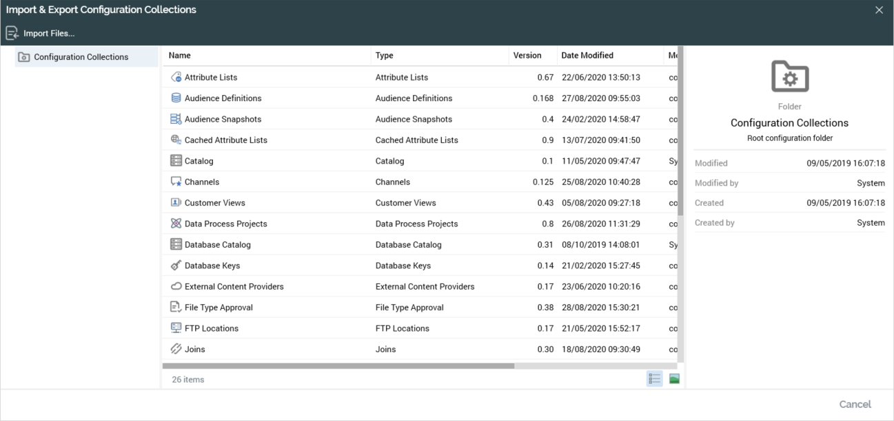 Configuration objects, like database keys, resolution levels and audience definitions, are stored in the RPI file system in file-like structures called configuration collections. All instances of a particular configuration object are stored in a single configuration collection – for example, all channels are stored in the Channels configuration collection.