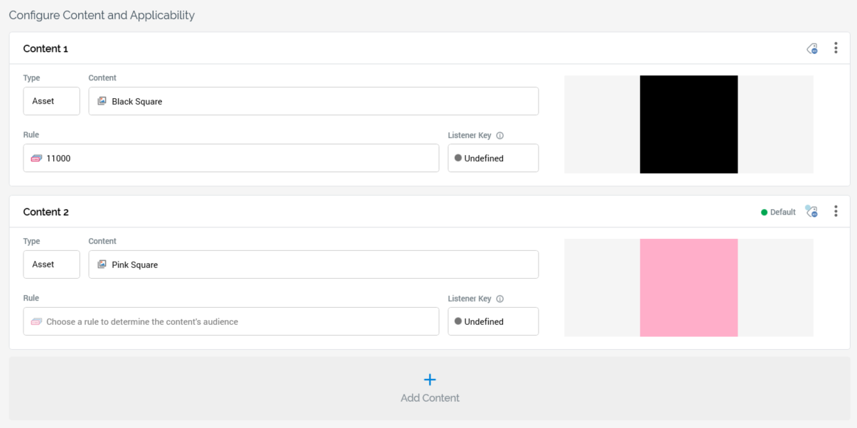 The Configure Content and Applicability section is used to define the content to be served by the smart asset, and the specific rules that govern the rendering of each element. It contains a list of content elements. Each content element exposes the following properties, shared by all relevant smart asset types: