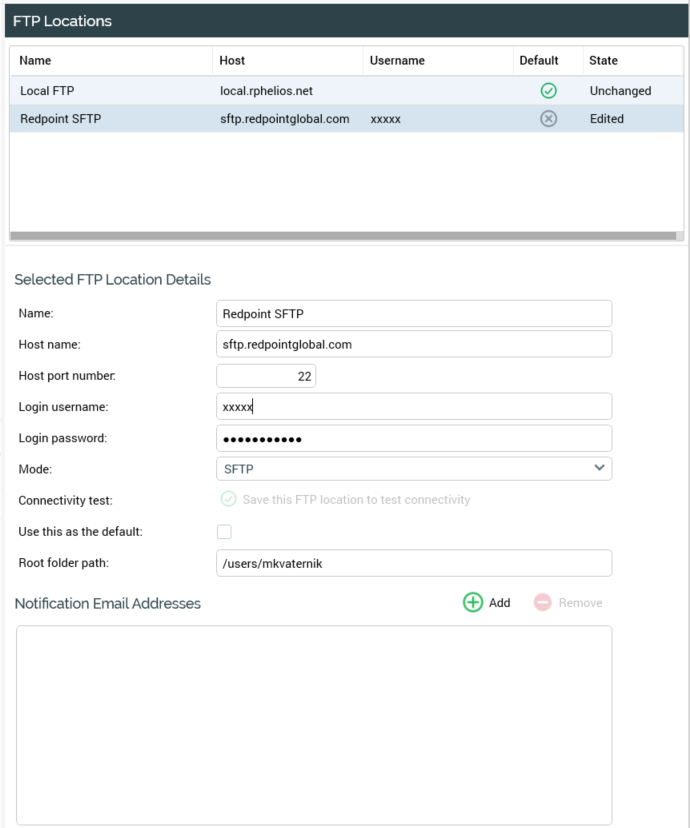 FTP locations are used when configuring data extract channels and interaction export activities. Configuration of FTP locations is carried out in the FTP Locations configuration interface.
