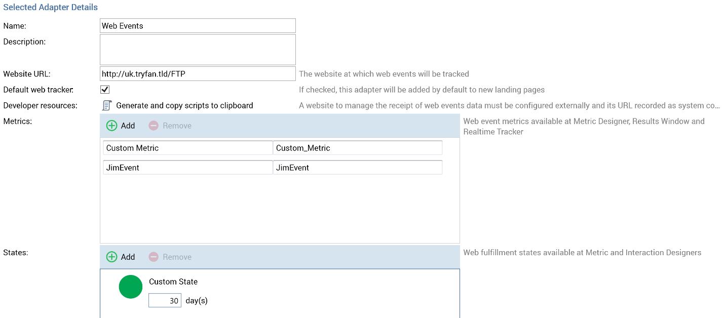 You can also attach web events adapters to a landing page. When you do so, the necessary script to manage the collation of web events states and metrics is automatically added to the landing page. Note that a web events adapter must be attached to a landing page for it to be used with web events.