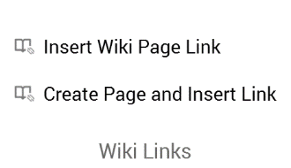 Create Page and Insert Link: available at the Wiki Page Designer only. Presents the File System Dialog, within which you may specify the filename and location of a new Wiki page. When you invoke OK, the new page is created and a link to it embedded within the current Wiki page at the current cursor position.