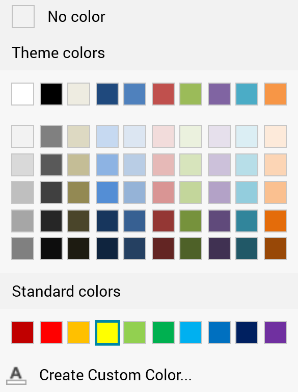 Text Highlight Color: this field facilitates direct application of the most-recently selected color. Clicking the accompanying dropdown displays a dialog: